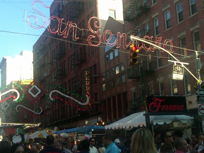 …and by that title to this post I mean the Feast of San Gennaro! Went for the first time this weekend; so fun, ridiculously cluttered, but saw everything I HAD to see to get a full grasp of this festival. Everything from horrible slushy “alcoholic” (maybe-not) drinks and AH MAY ZING food, to italian juiceheads (HOT) with their wives and kids, and tons of NYPD flirting with girls and NOT patrolling the streets- or is it one in the same? For those who don’t know: