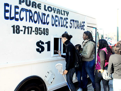 With a mobile phone ban in place at public schools in New York City, an entrepreneur has come up with a successful business catering to phone toting students. Vernon Alcoser has parked trucks outside two Bronx schools to store student phones for $1 per day.