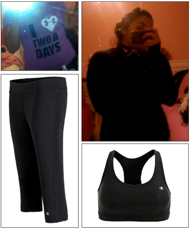 A week in and I’ve had to go buy dri-fit workout clothes. I hit up Modell’s after work and bought a new Champion sports-bra (much needed), workout champion knee tights, as well as a cute pink “I ❤ Two a Days” Under Armour tee, and an AMAZING Nike dri-fit pullover.