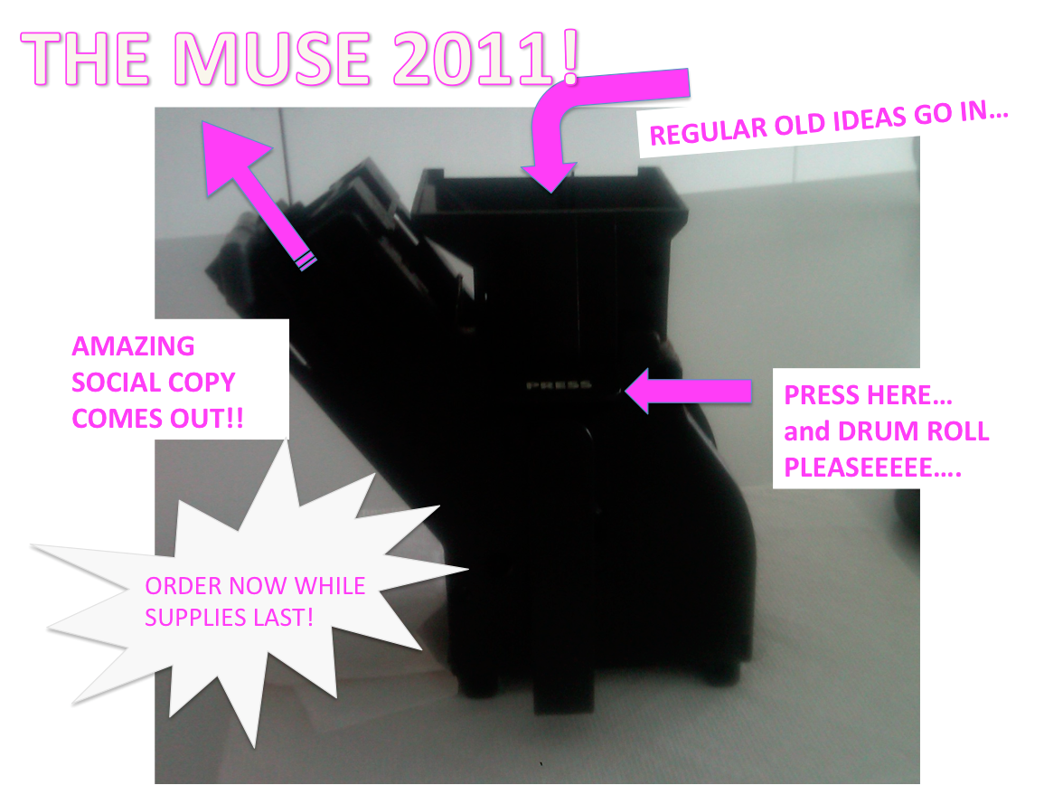Look no further!! The COFFEE MAKER MUSE 2011 is here! Grind amazing content for any campaign! Boring ideas go in… just press the button and brew some incredible copy! Call 1888-GET MUSE TODAY! BUAAAAHAHAHAHHAHAH