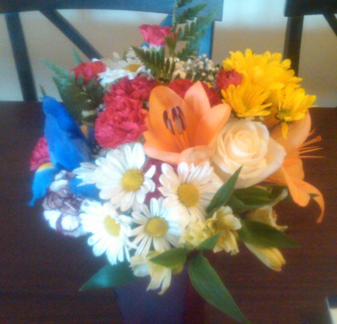 Check out this bouquet I picked up yesterday, a bit much if I do say so myself, but I find it warming, really. The orange, red and dark blue/purple, is softened by the white, yellow and touch of green.