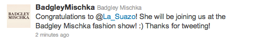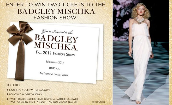 I have officially for the 3rd time over now- fallen in love with Twitter. Why? Well because I’m a lucky girl today! A couple of days ago I decided to enter this sweeps for 2 tickets to Badgley Mischka‘s show in Fashion Week– with honestly, no intention of winning…I’ve just never won anything before!
