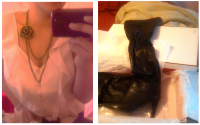 Suaz wore: Ann Taylor Loft blouse, Glam Noir necklace, INC fitted Pant, Coach Knee-High boots.