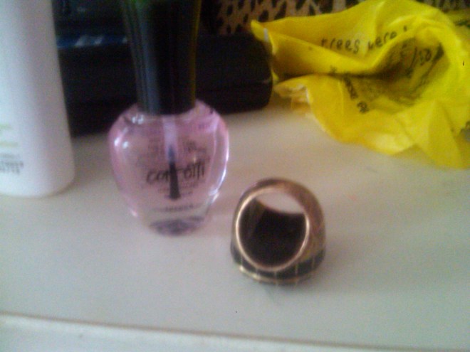 I went to CVS and invested in a cheap $1 clear nail polish that I found by Confetti (can’t find a website anywhere)- and went to work on “painting” the inside of this ring- after several coats that dried fairly quickly- I decided to put the ring on the next morning.
