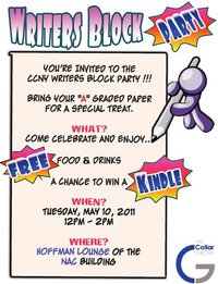 New York, New York – April 28, 2011– CCNY students will have a fun and engaging opportunity to celebrate writing to get some tips on improving their writing at the CCNY Writers Block Party, Tuesday, May 10, 2011 from 12 p.m.-2 p.m. at the Hoffman lounge in the North Academic Center (NAC). Participants get free food, drinks, fun giveaways and are eligible to win a free Kindle.