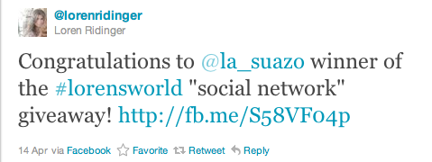 Loren (an amazing role model to aspiring corporate powerful women) tweeted a contest to make sure you were following her and tweet “why you love social media” to win the book Accidental Billionaires which was the foundation of the movie The Social Network ! Easy… for me! Tweeted and let her know on the post: