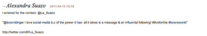 (“@lorenridinger I love social media b.c of the power it has- all is takes is a message & an influential following! #iliveforthis #lorensworld”)