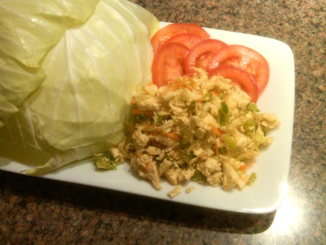 Ingredients: I just seasoned with pepper and lemon- and added celery, green peppers. carrots and some raisins- and decided to have it with cabbage, like lettuce wraps! Kind of looks like tuna right? SO much better though!