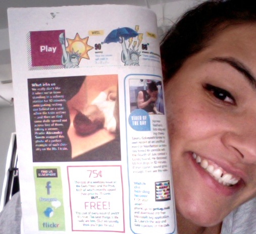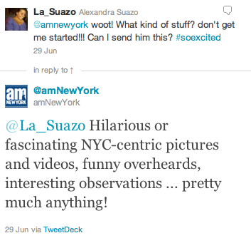 Well, that same day I’d noticed the featured “Play” section in the AM New York – a mini section- highlighting ‘social’/street-fun from fans. I decided I’d hustle to get my name/twitter handle mentioned on there! So I went to tweeting: