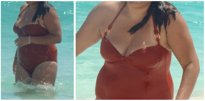 For the curious cats: almost a year ago to-the-day at Culebra Island, PR (where BTW: looking back I didn’t think I looked as beached whale as I now feel I looked,) compared to a very recent photo at the beach.