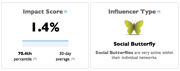 – Finally, Twitalyzer: a “Social Butterly” with an impact score of 1.4% within the 70.4th percentile; ranking in the 70.4th percentile means that my score is higher than 70.4 percent of the hundreds of thousands of active Twitter accounts being tracked.