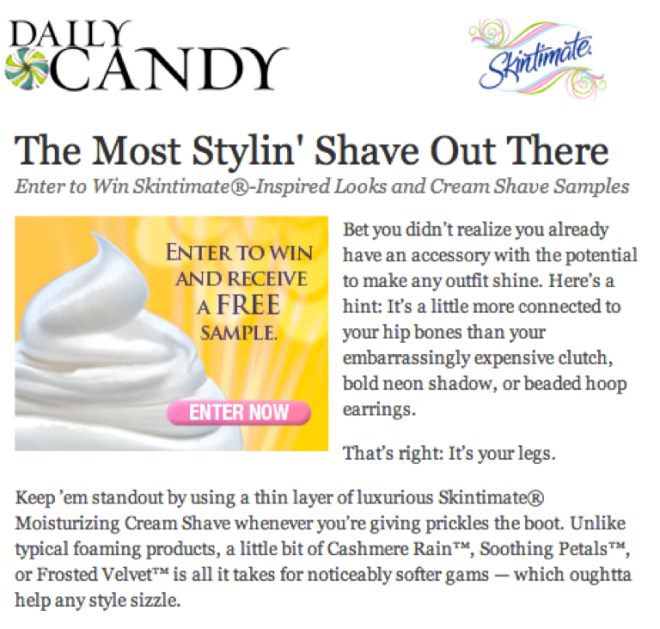 Enter for your chance via DailyCandy & Skintimate to land one of three Skintimate-inspired looks (think Party Perfect, Weekend Chic, or Beach Babe) for absolute fashion success whatever the occasion, runners-up score a sample-size Skintimate® product*, and everyone can download a Skintimate coupon.