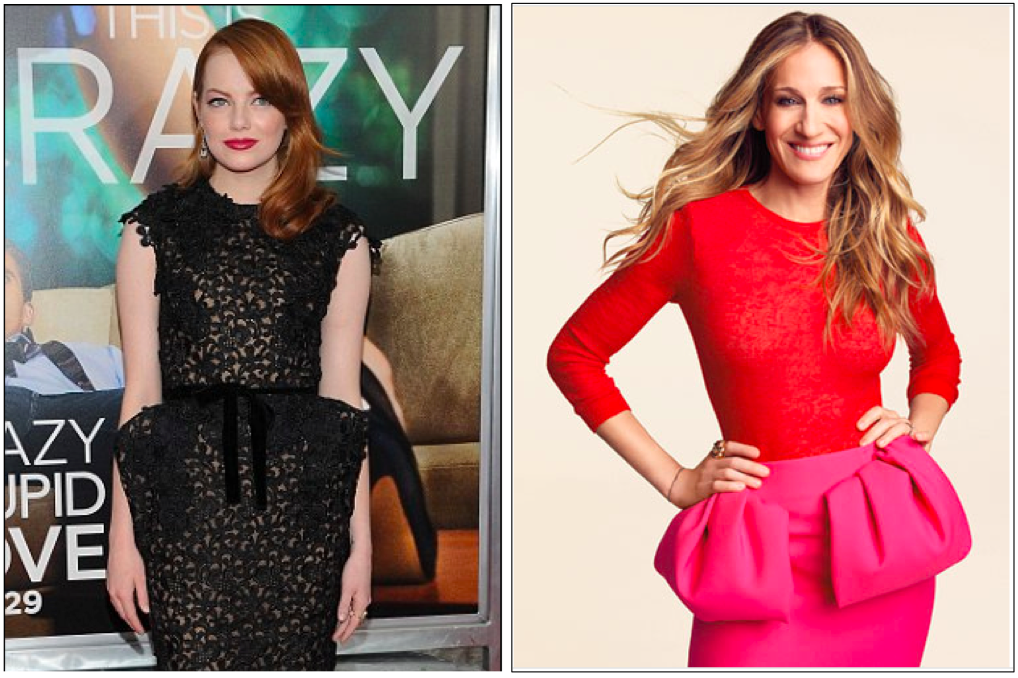 One trend I’ve seen several times over now is this protruding, structured hip design. Check it out on Emma Stone and SJP.