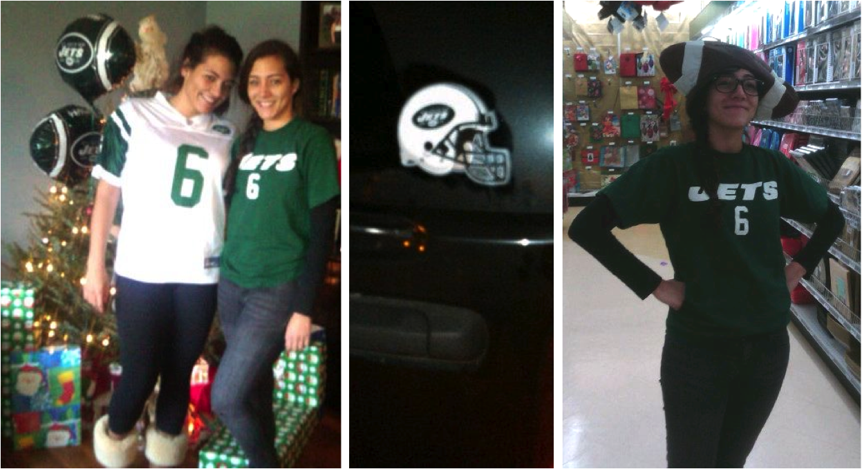 While we were boozed up, supped up alla #GreenIt and ready to-go, we sadly watched the Jets lose it to the Giants in a Christmas Eve game that’s going to cost us bragging rights for a LONG TIME! On a happier note, I submitted the photo above (left) to the Week 16 Motorola MotoPics Contest on the New York Jets FB Page– and they chose it! While I had no idea it was up for voting (for an autographed ball,) it’s exciting to see we got 14 random likes!