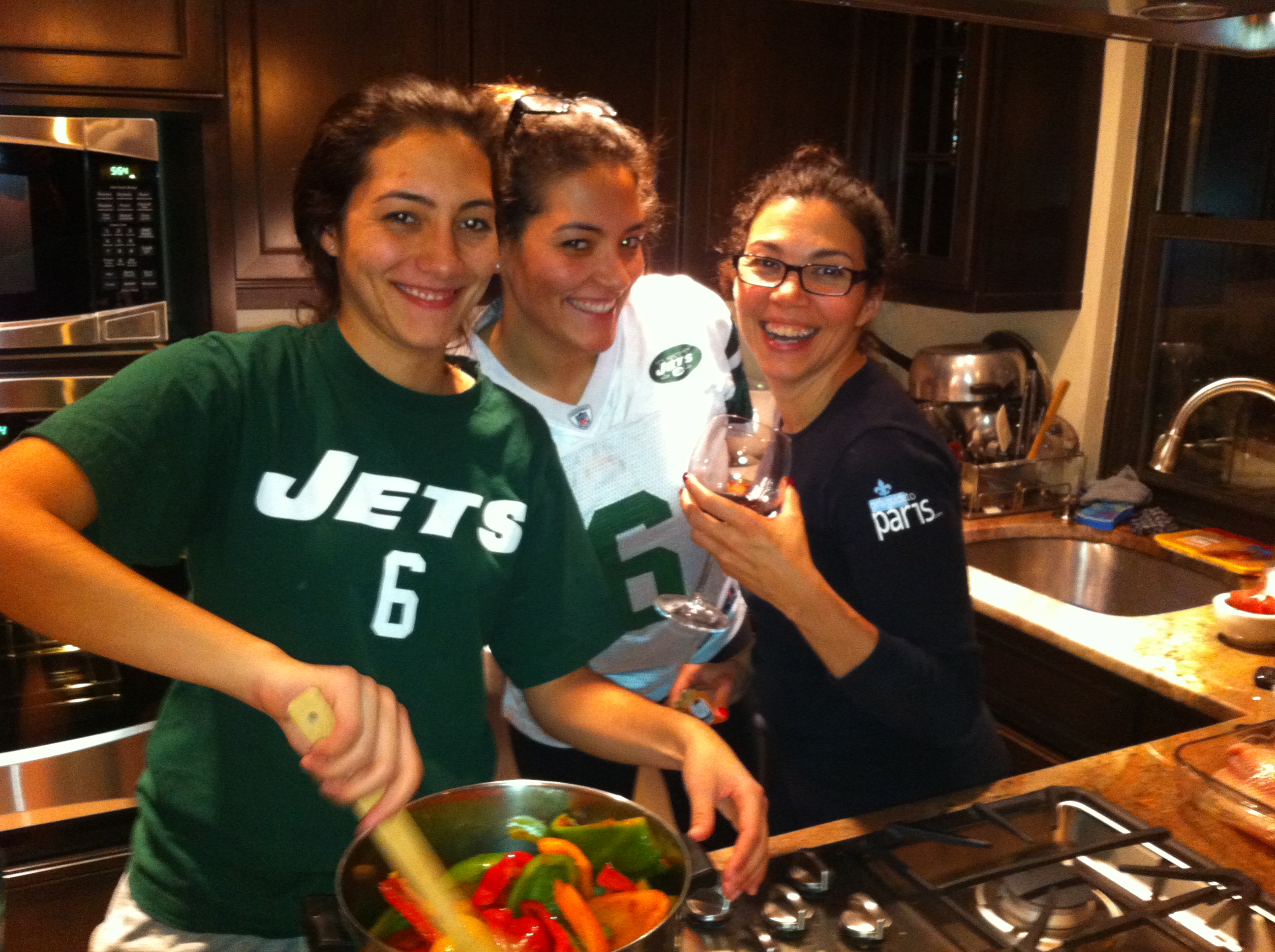 While I normally do not contribute to dinner dishes because I’m NO GOOD in the kitchen, I signed up for drinks and dessert. I also attempted a Peperonata dish I found in the December Food Network mag (which you can see my sister kicking off in our new kitchen below.)