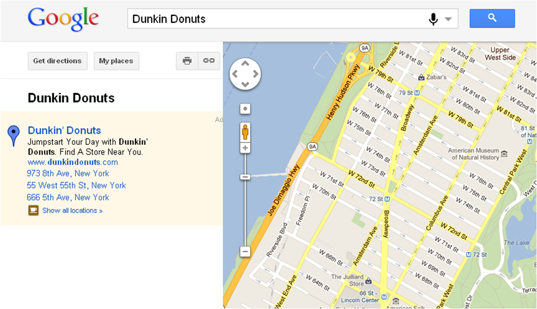 I STILL wasn’t convinced so I resorted to the Dunkin Store Locator, and lo and behold the closest DD in a 1 mile radius of 10023, is in the zip code 10024, which is north of 72nd (84th St to about 104th) on 86th and Amsterdam.