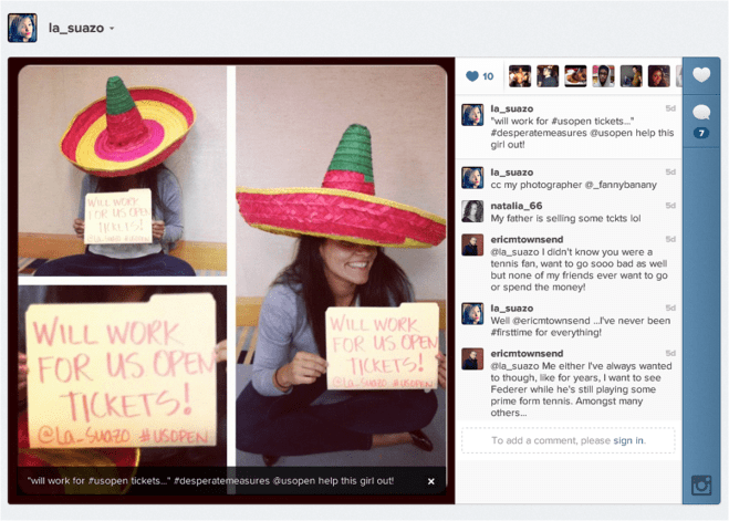 I’ve never been to the @USOpen. Am I interested in Tennis? Meh, not so much. Would I enjoy experiencing the US Open at least once in my life? Absolutely. So I decided, like a homeless person gets in our faces on the subway for money, that I would “beg” the US Open for tickets; I tweeted them this instagram: