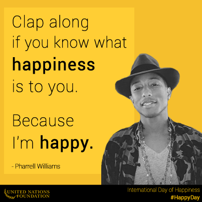 Kudos to the UN Foundation for teaming with Pharrell to use his “Happy” song as today’s anthem. What are you happy for?