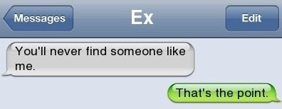 Nice girl that I am, I totally entertain it but you know what? In the future, I have to be a nice big B and shut it down before it has the chance to spiral into… his recent ex, or not-so-ex, sees that he’s been texting me, steals my number from his phone and texts me a “fair warning” about said bum ex-boyfriend. Yes, friends, that happened.